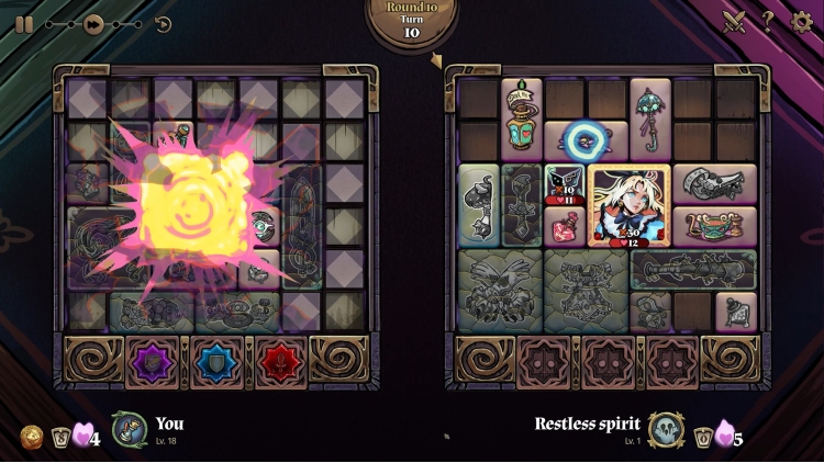 Turnbound'da, her seansta diğer oyuncuların kapana kısılmış ruhlarıyla karşı karşıya geldiğiniz, gerçek oyuncuların geride bıraktığı karolarla eş zamanlı olmayan PvP savaşlarında mücadele ettiğiniz perili bir masa oyunundan özgürlüğe doğru zekânızla yolunuzu açmaya çalışıyorsunuz. Bu, rekabetçi bir envanter yönetimi oyunudur; ızgaranıza yerleştirdiğiniz her karo, savaşlar boyunca dalgalanan ve öngörü ve yaratıcılığı olanları ödüllendiren stratejik bir neden-sonuç döngüsüne sahiptir.
